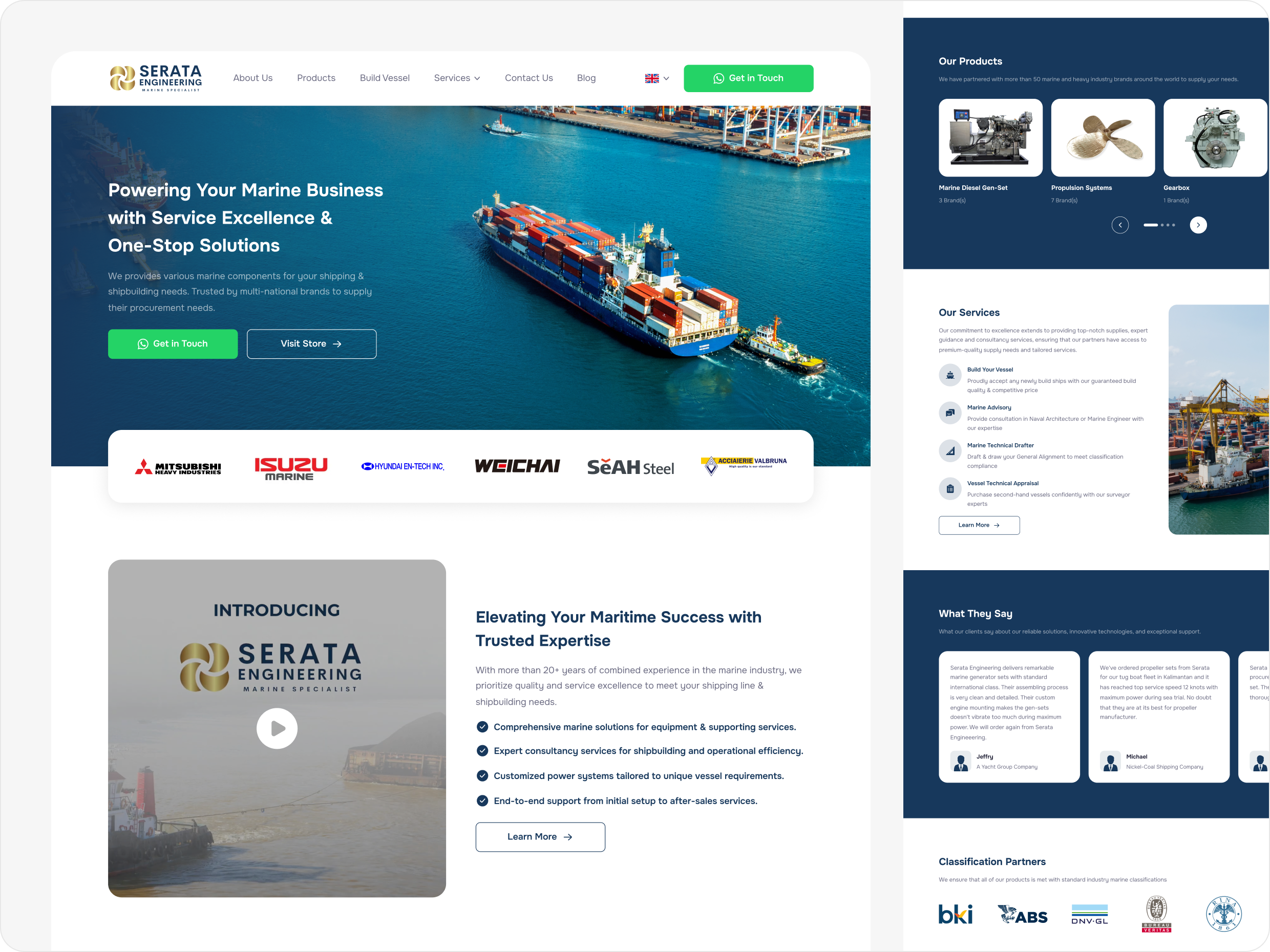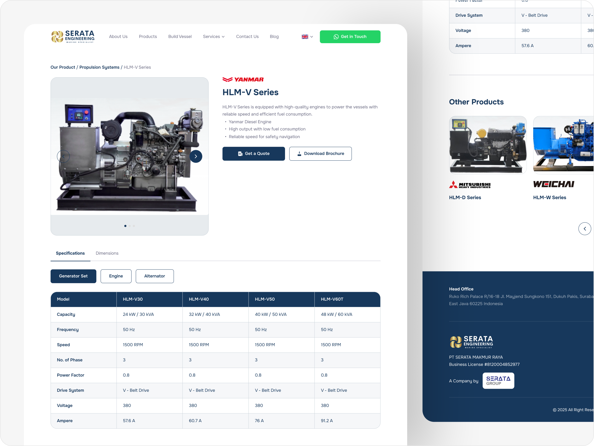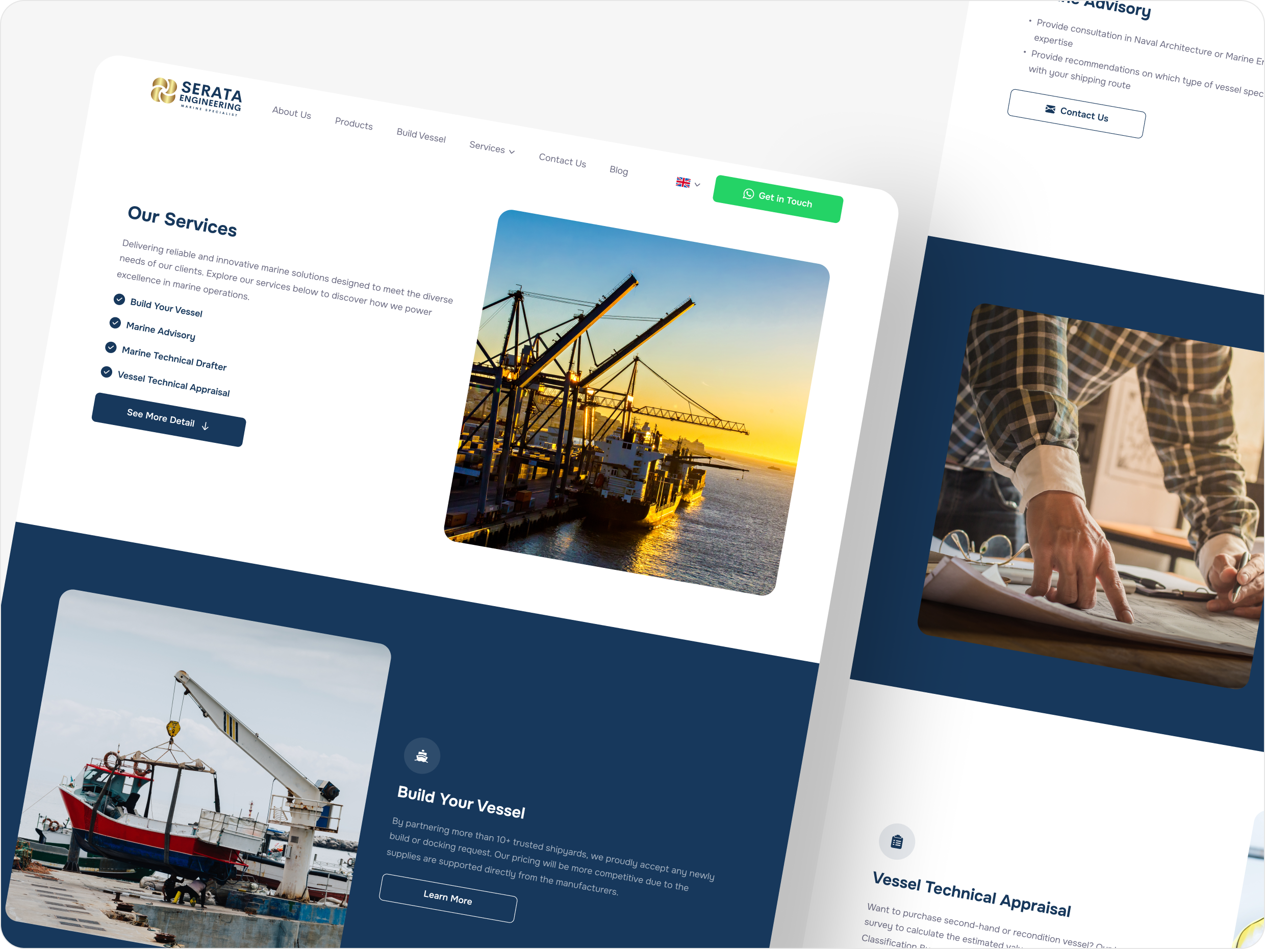 Website Serata Engineering dirancang untuk menampilkan layanan teknik dan produk maritim dengan cara yang modern dan profesional.