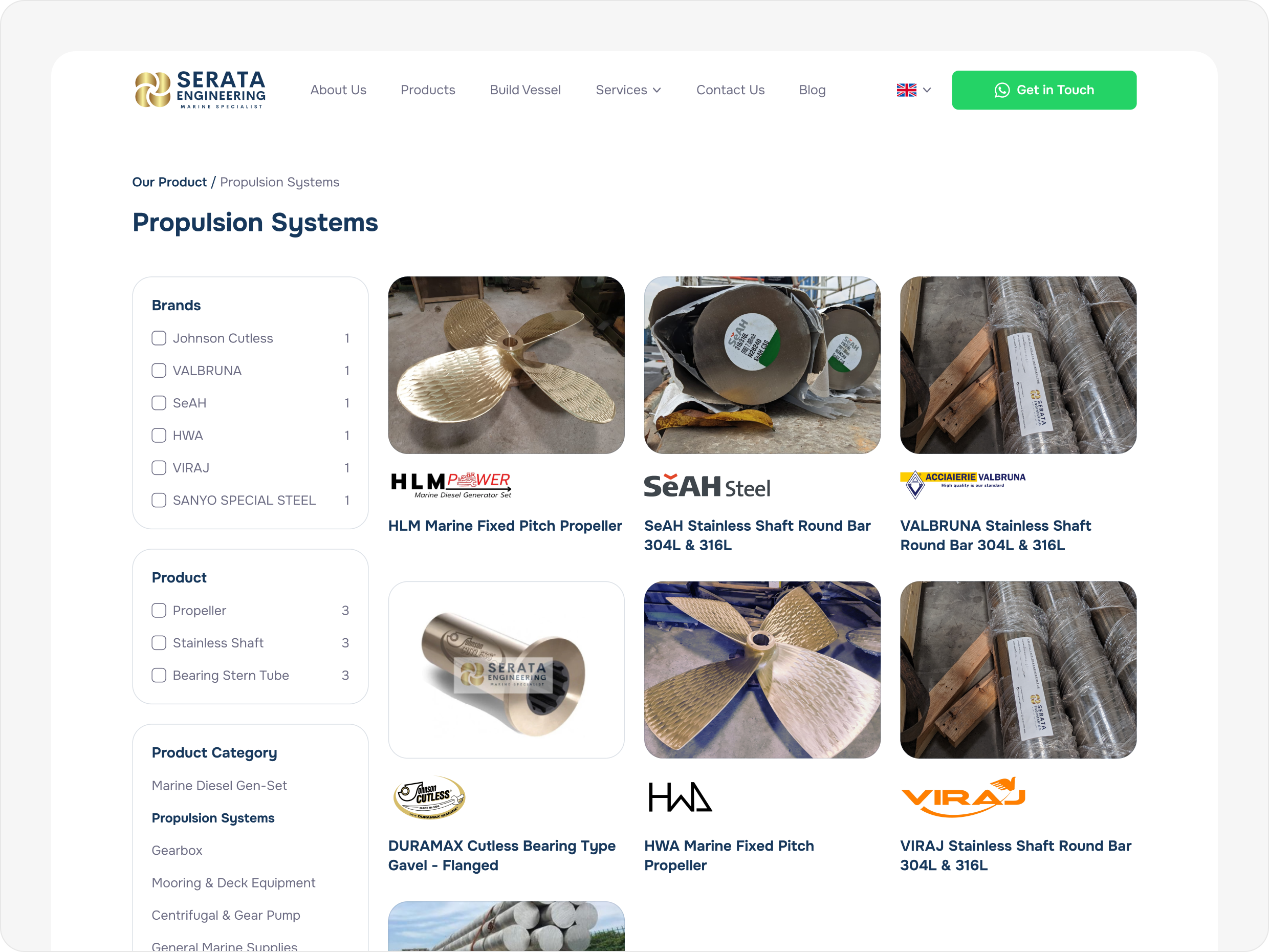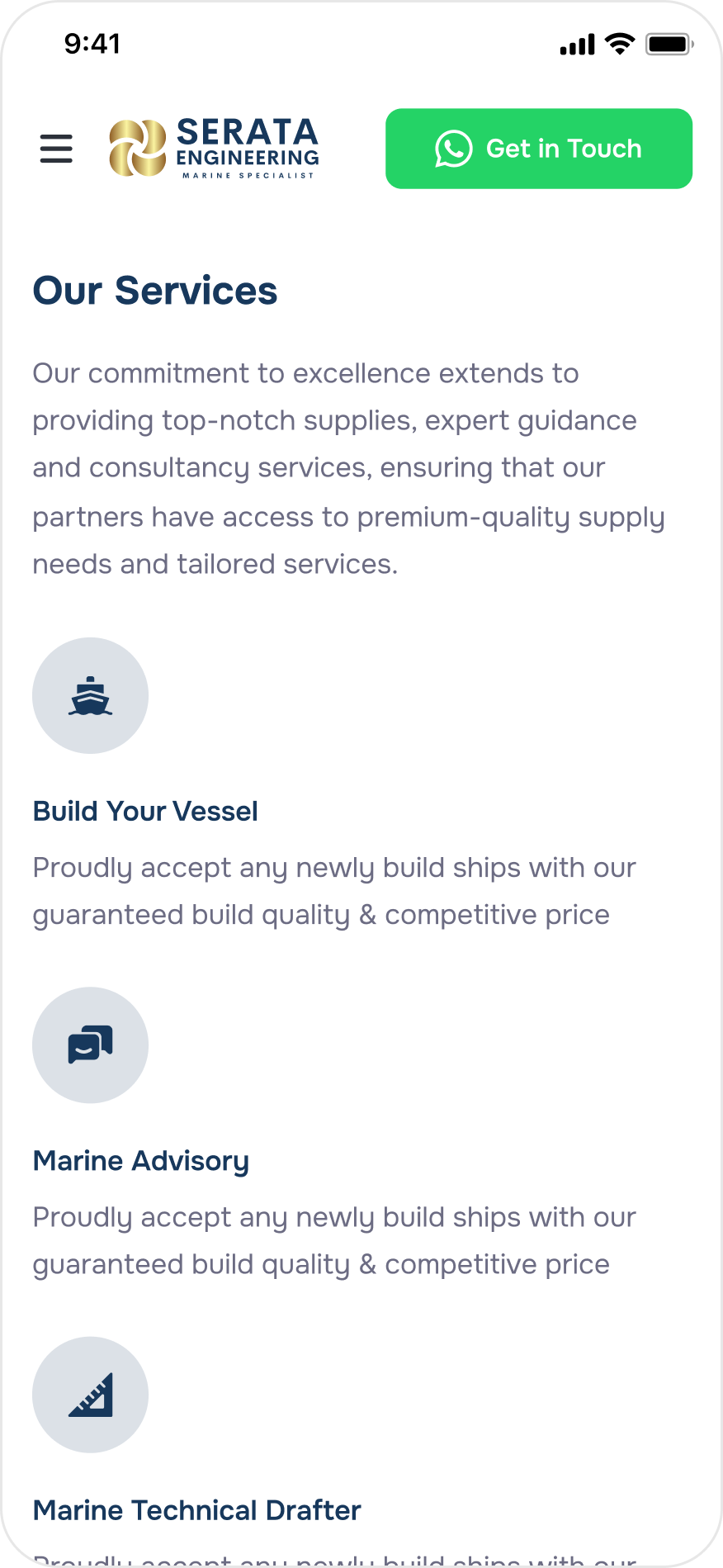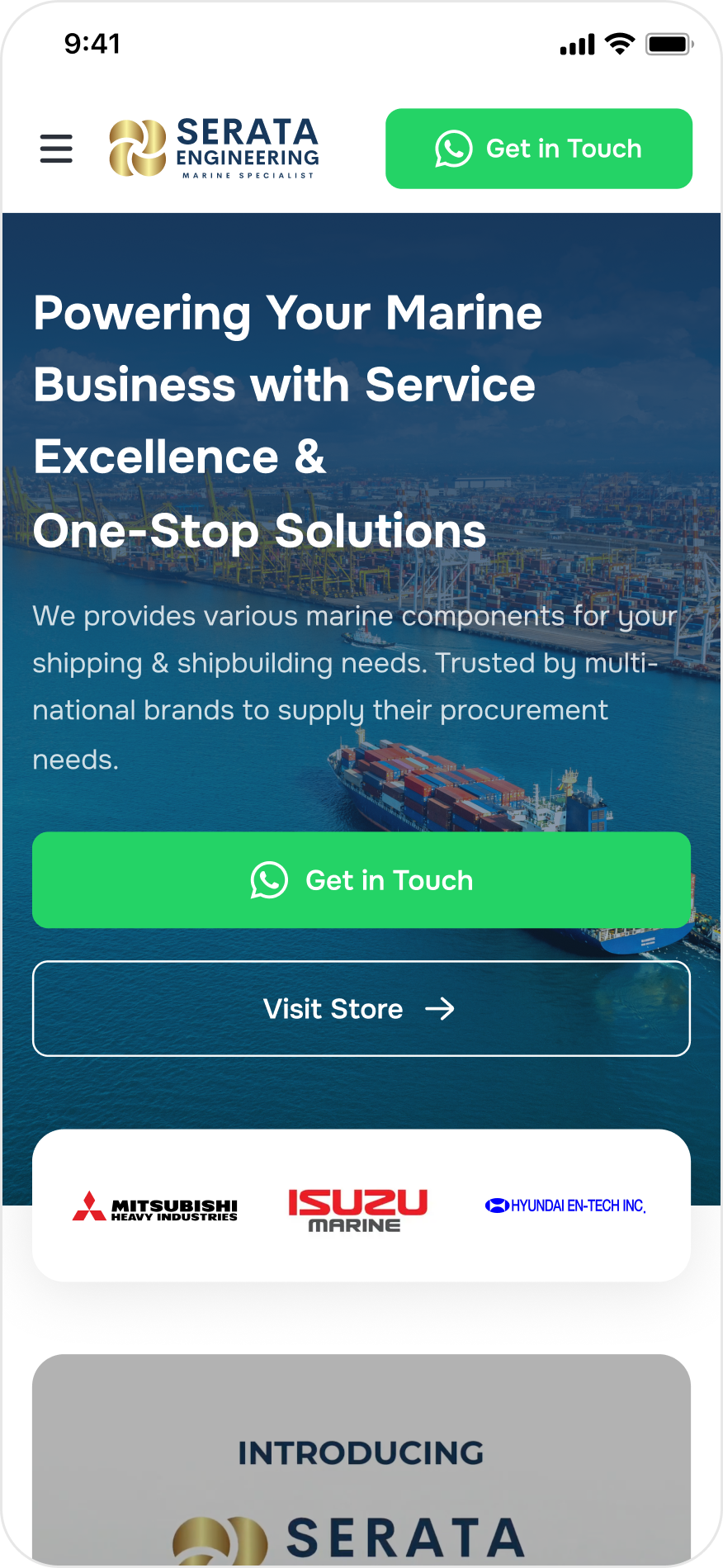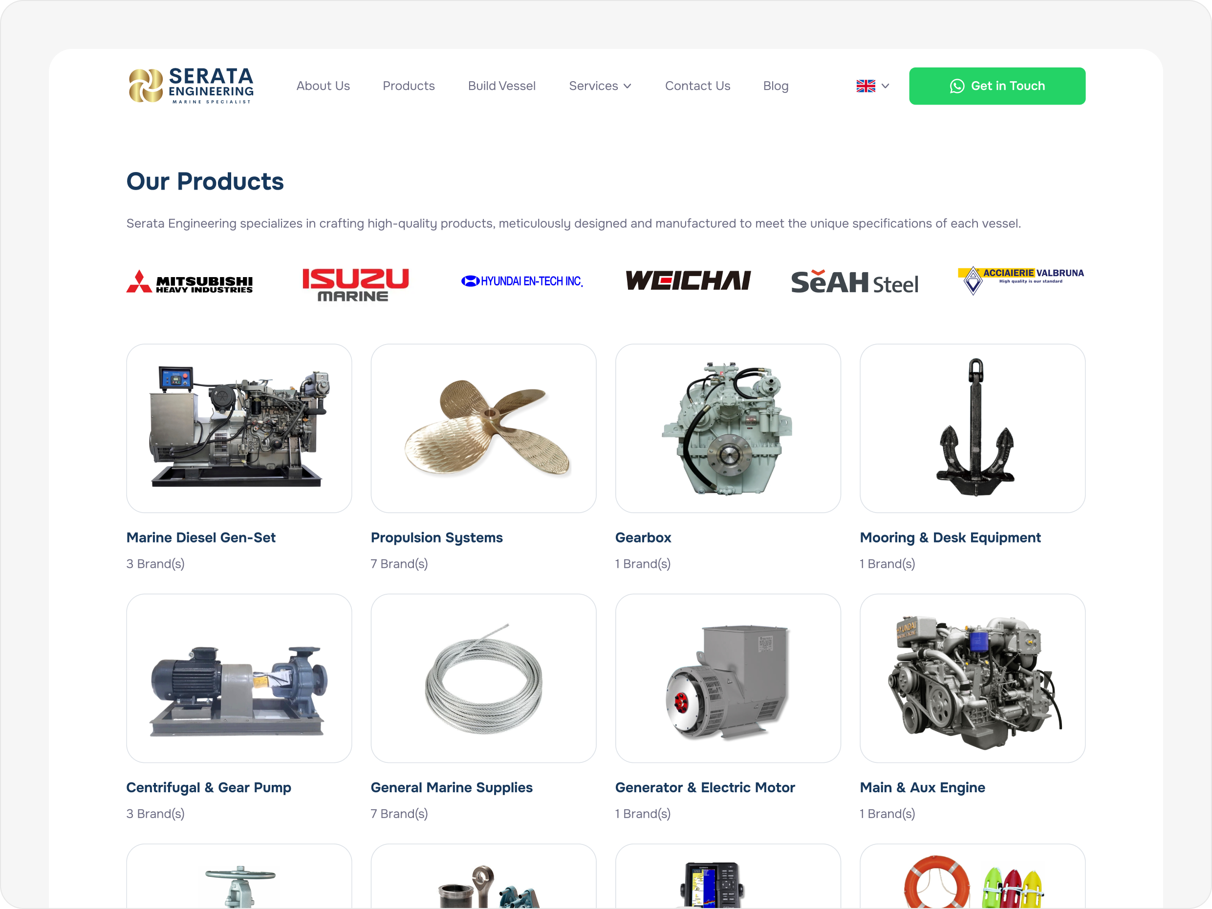 Website Serata Engineering dirancang untuk menampilkan layanan teknik dan produk maritim dengan cara yang modern dan profesional.