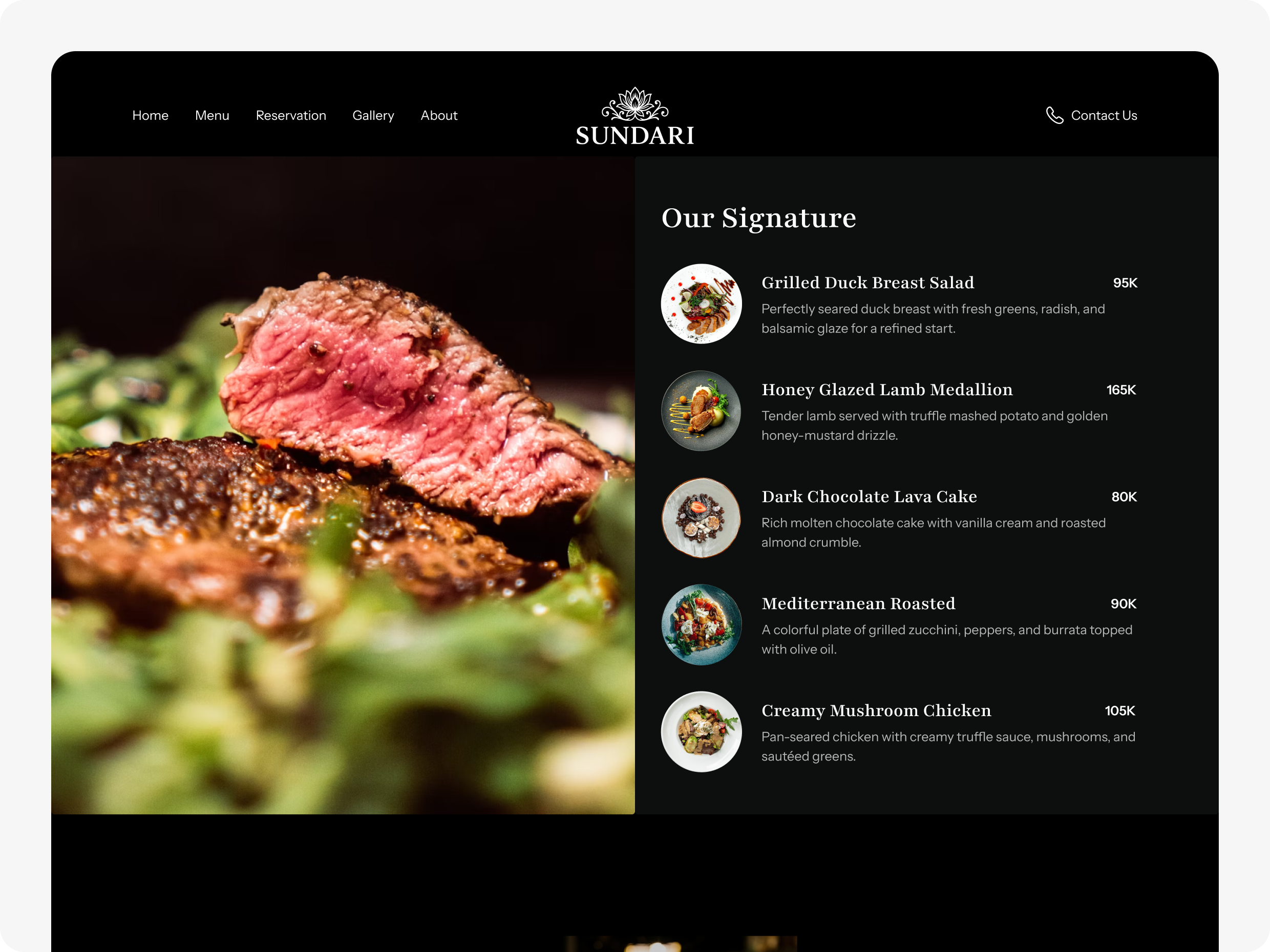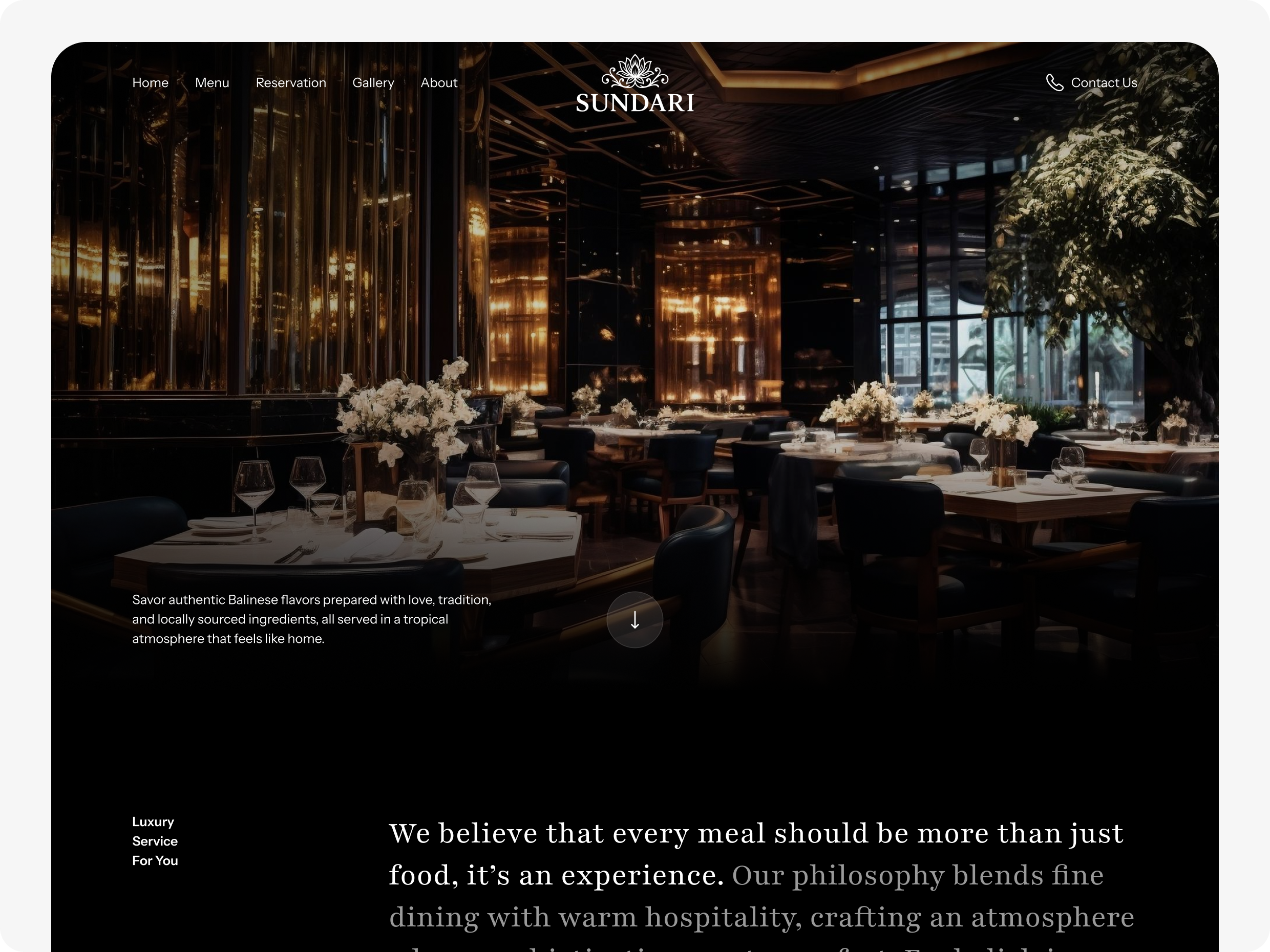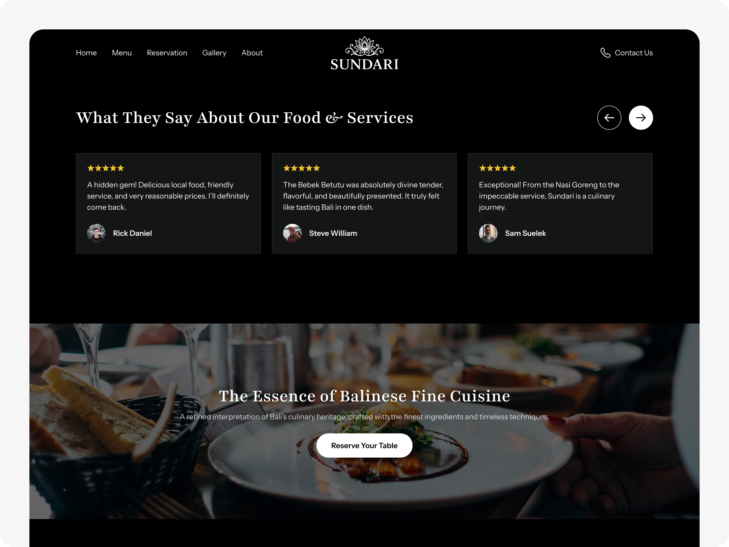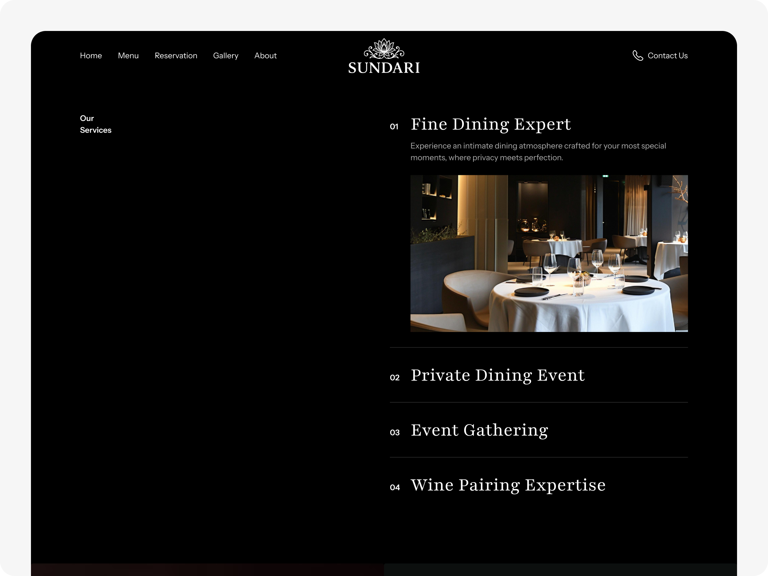 Website ini dirancang sebagai touchpoint penting bagi tamu untuk mengenal karakter restoran, merasakan atmosfer yang intimate, melihat menu spesial, hingga melakukan reservasi dengan mudah. Dengan pendekatan visual yang luxurious dan storytelling yang kuat, platform ini membantu mempertegas citra Sundari sebagai destinasi kuliner premium bagi momen istimewa.