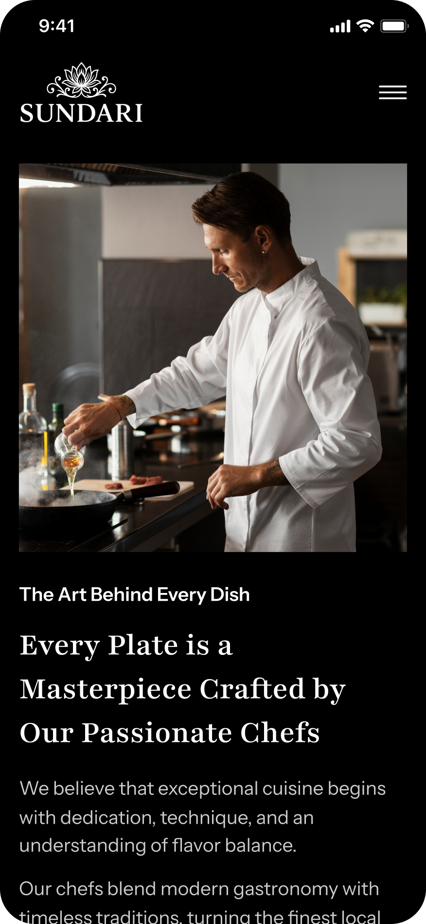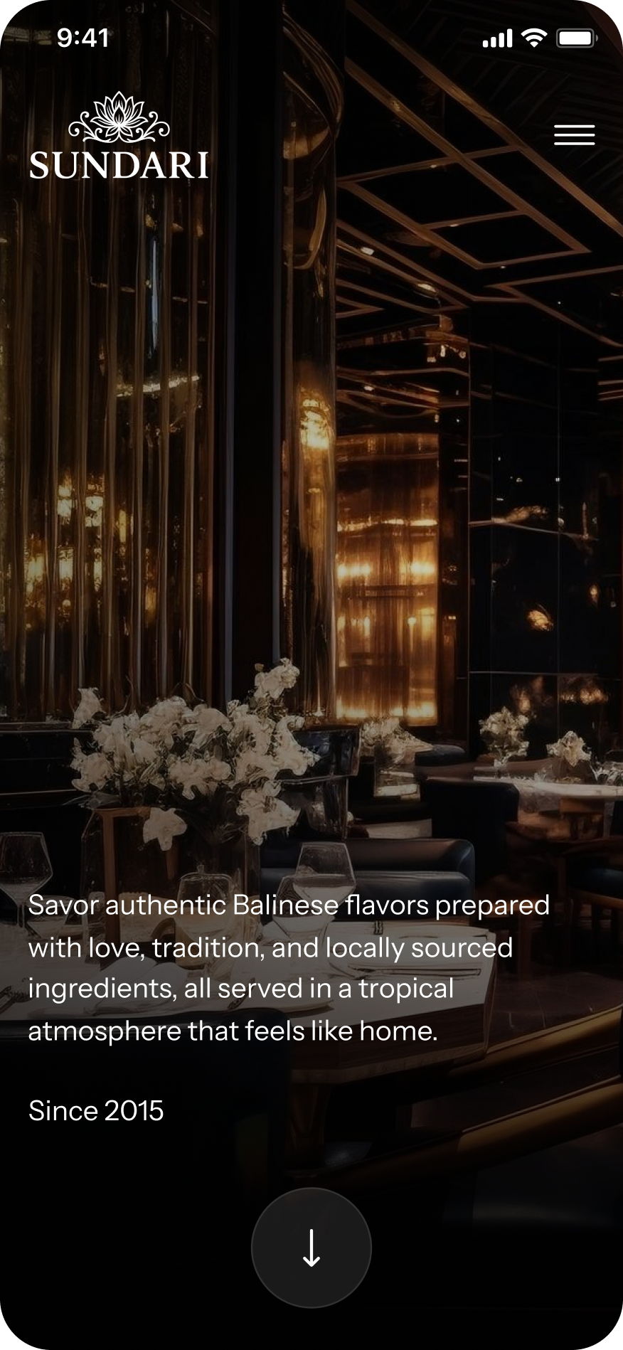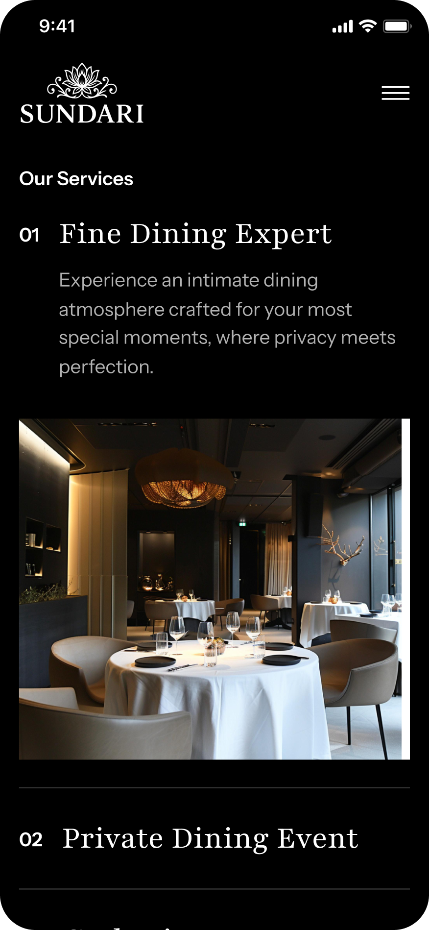 Warna gelap dan aksen keemasan menciptakan rasa eksklusif dan sophisticated, sementara komposisi visual fokus pada ambience restoran serta kualitas pelayanan. Struktur konten dibuat simpel dan intuitif sehingga pengguna dapat menjelajahi informasi dengan nyaman, memperkuat kesan profesional dan kohesi brand Sundari di mata tamu lokal maupun internasional.