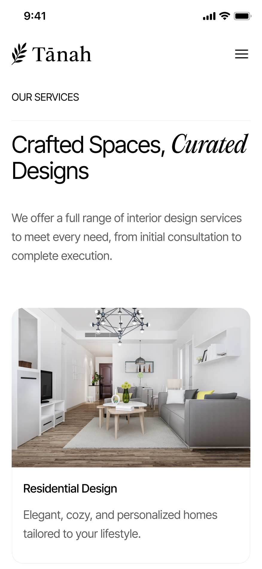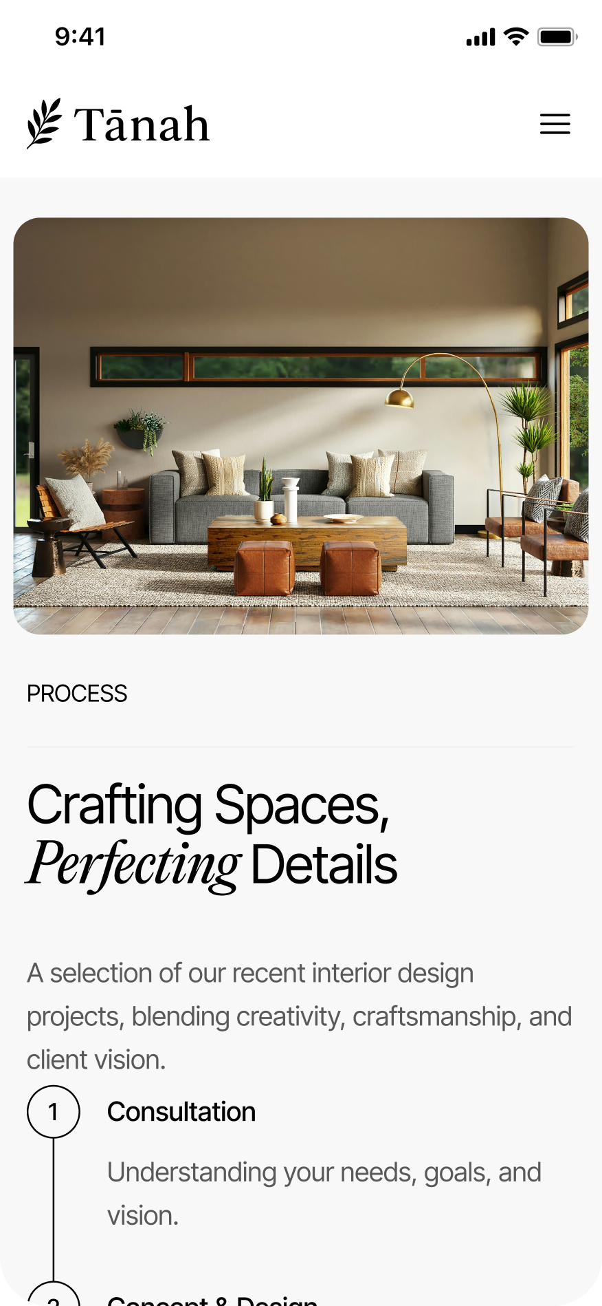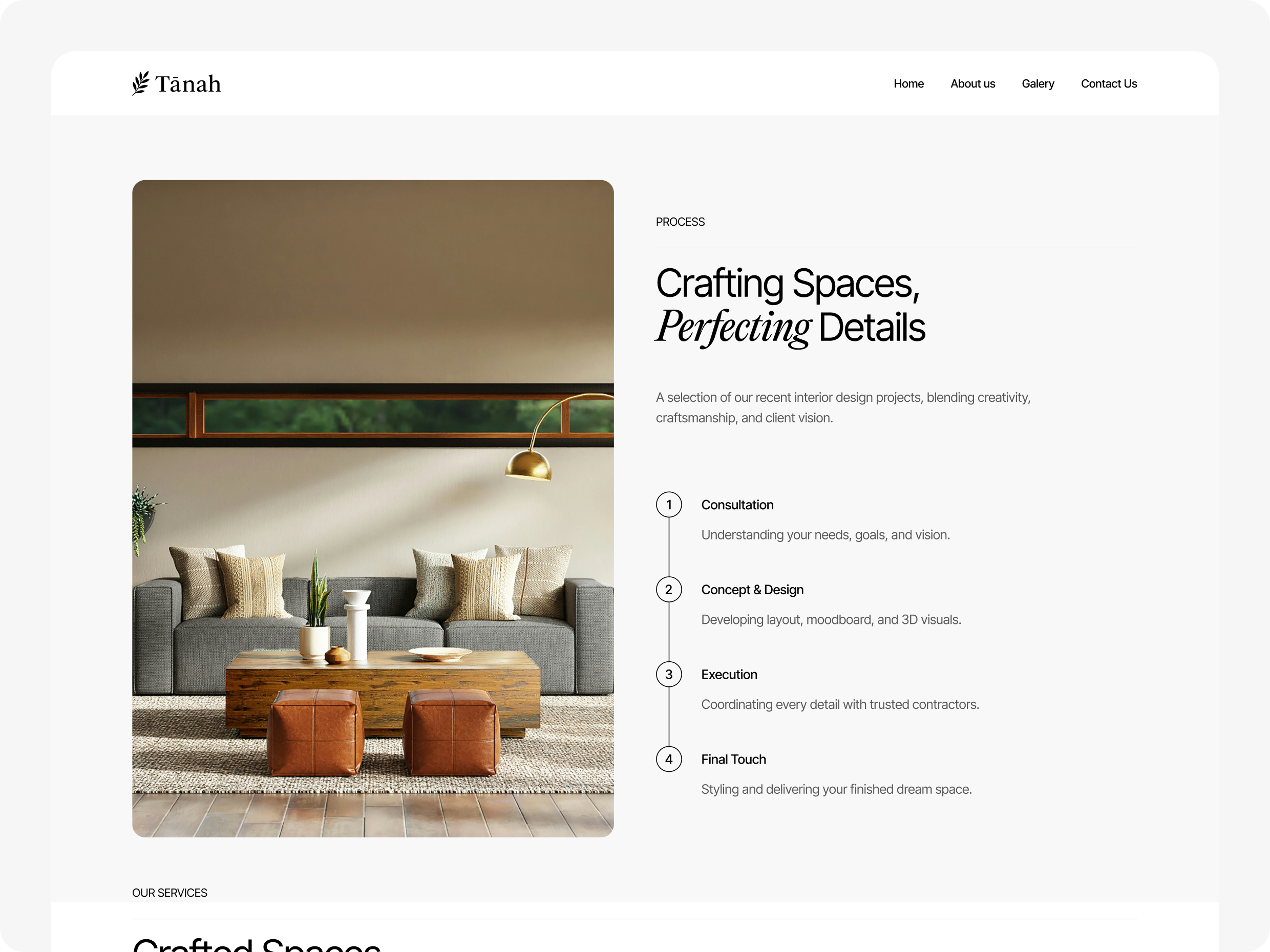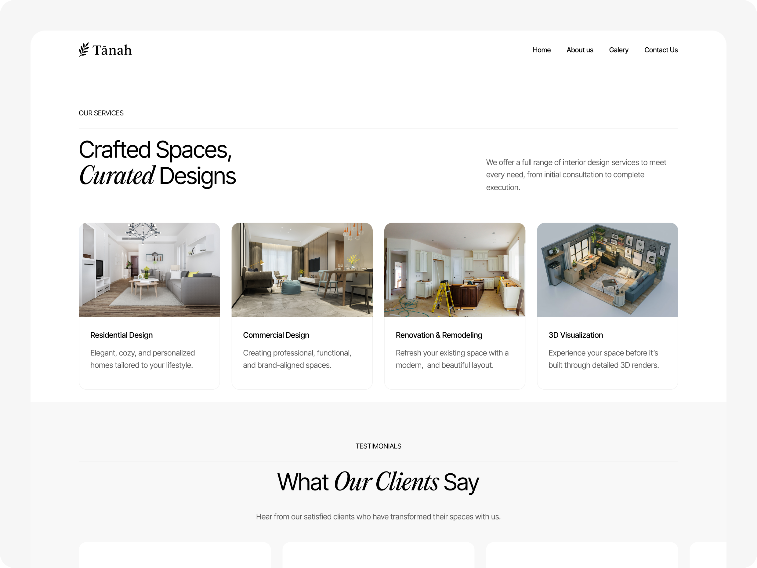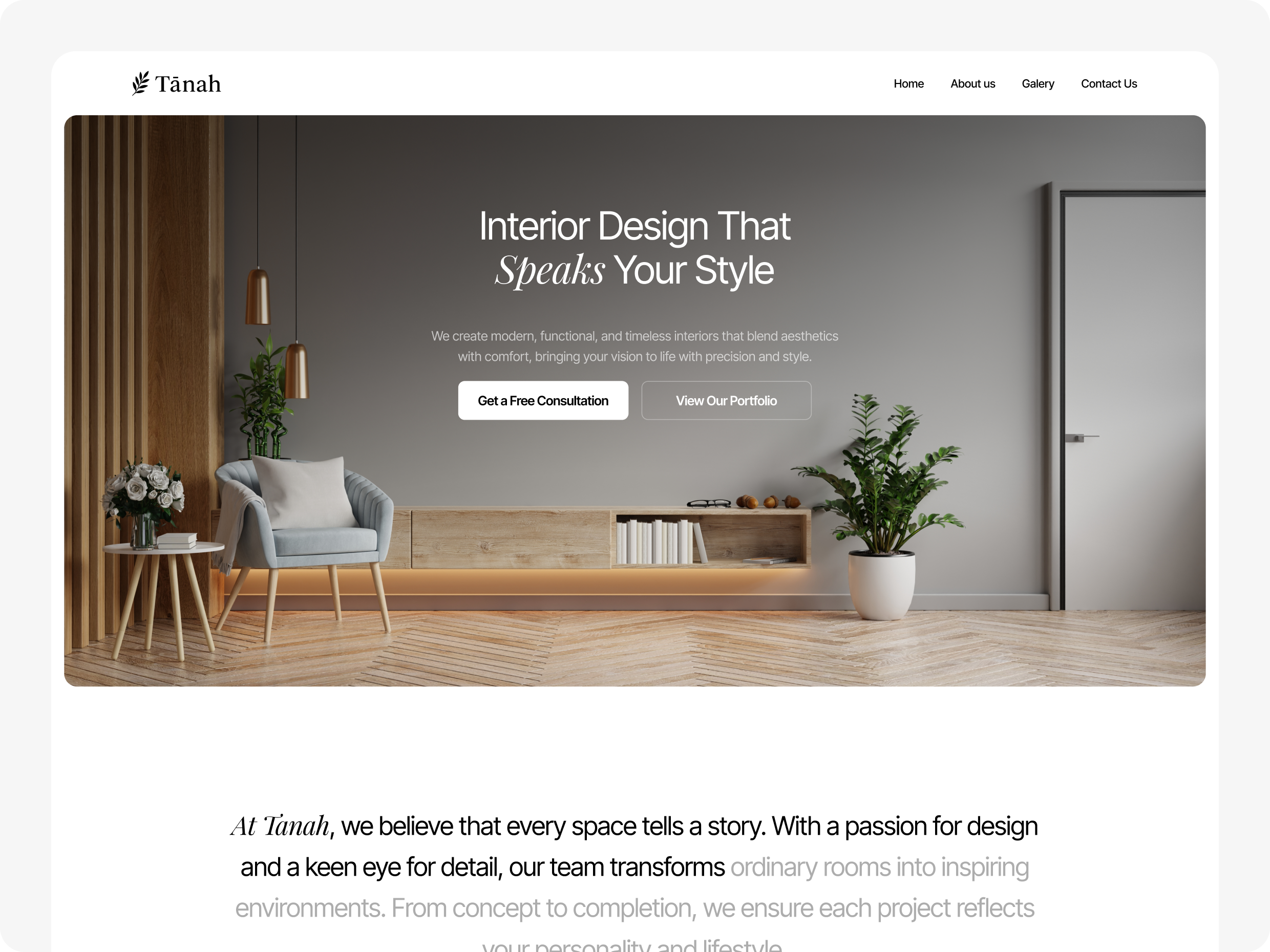 Website ini disusun agar calon klien bisa melihat gaya visual Tanah, memahami pendekatan desain, hingga mengeksplorasi proyek yang telah dikerjakan. Dengan tampilan yang bersih dan storytelling yang ringan, platform ini membantu Tanah membangun kesan yang profesional sekaligus kreatif, relevan bagi siapa pun yang ingin menciptakan ruang yang lebih nyaman, estetik, dan personal.